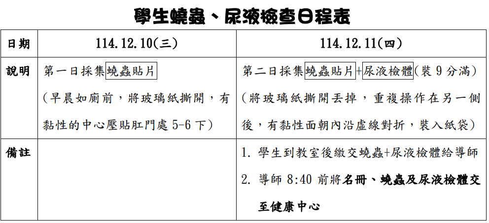 - 蟯蟲篩檢:第一日蟯蟲貼片採集為114年12月10日(三)